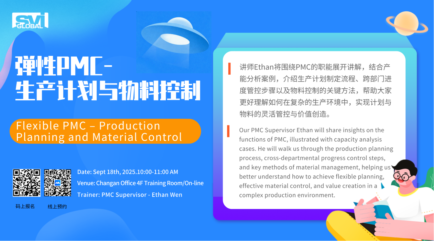 Our PMC Supervisor Ethan will share insights on the functions of PMC, illustrated with capacity analysis cases. He will walk us through the production planning process, cross-departmental progress control steps, and key methods of material management, helping us better understand how to achieve flexible planning, effective material control, and value creation in a complex production environment.