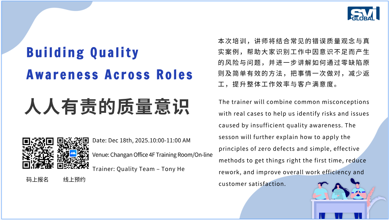 The trainer will combine common misconceptions with real cases to help us identify risks and issues caused by insufficient quality awareness. The sesson will further explain how to apply the principles of zero defects and simple, effective methods to get things right the first time, reduce rework, and improve overall work efficiency and customer satisfaction.